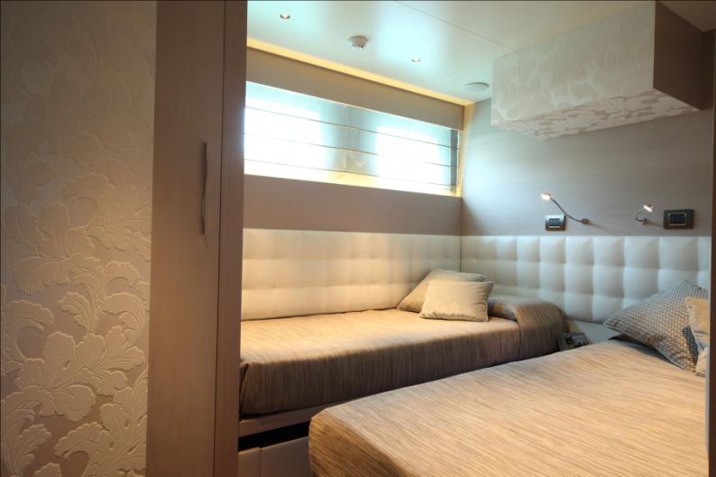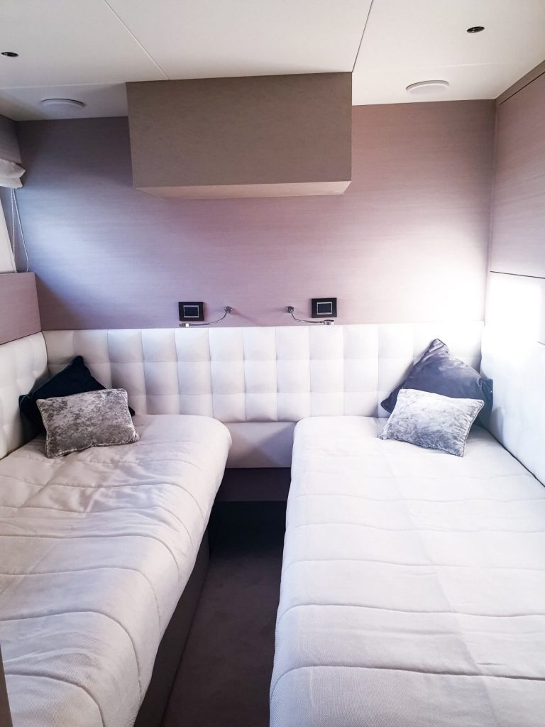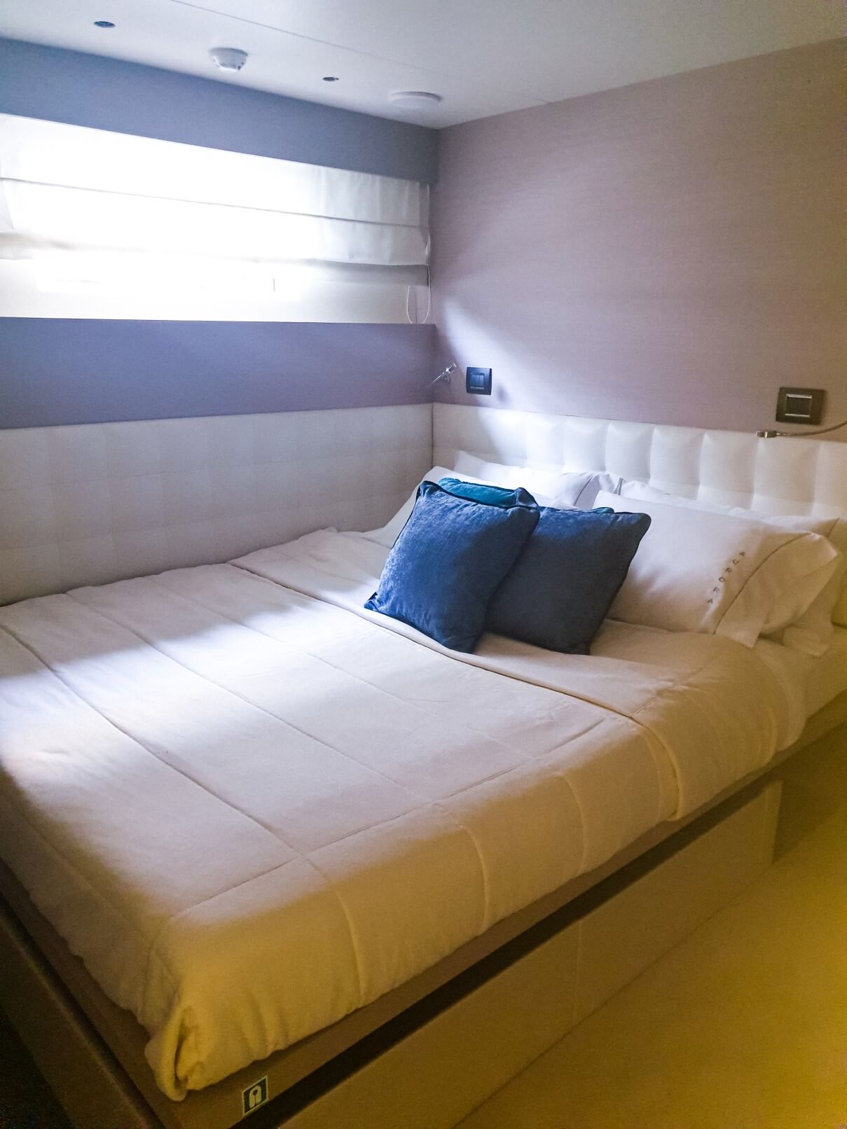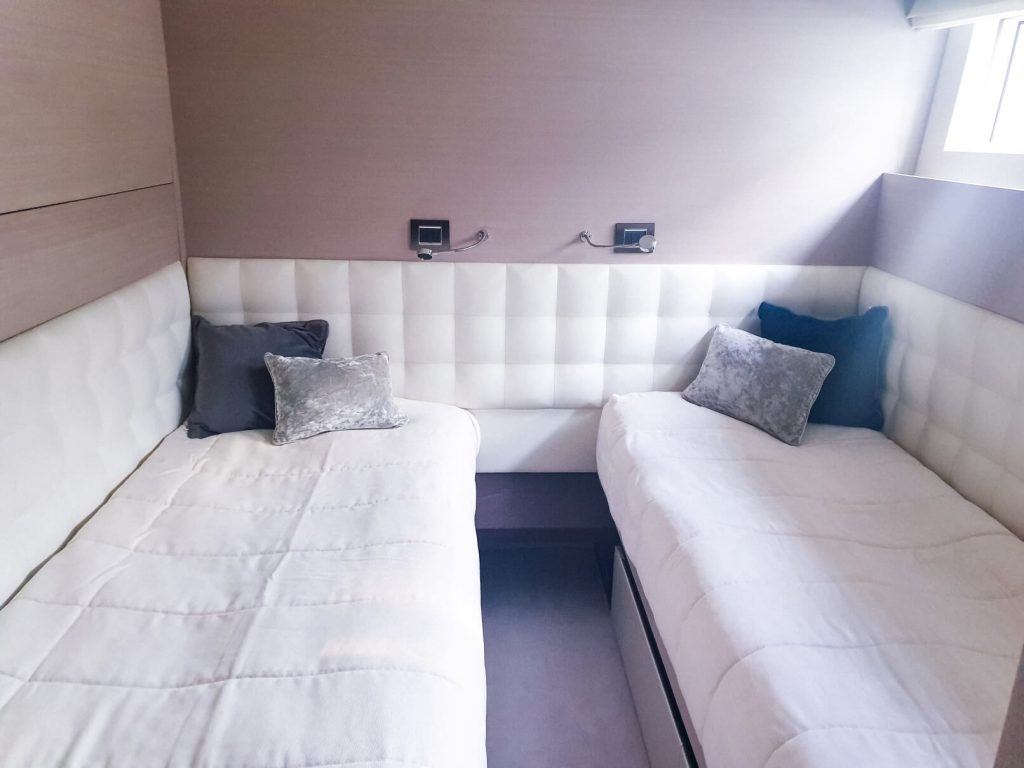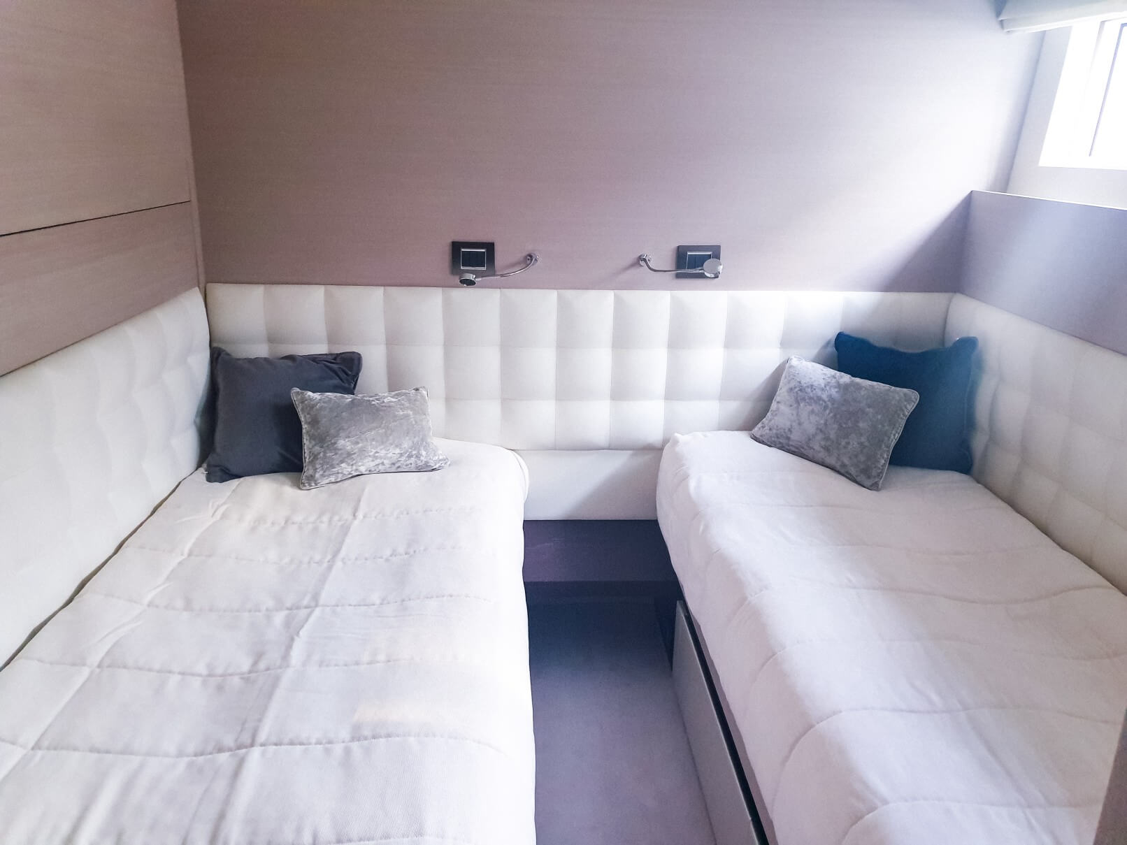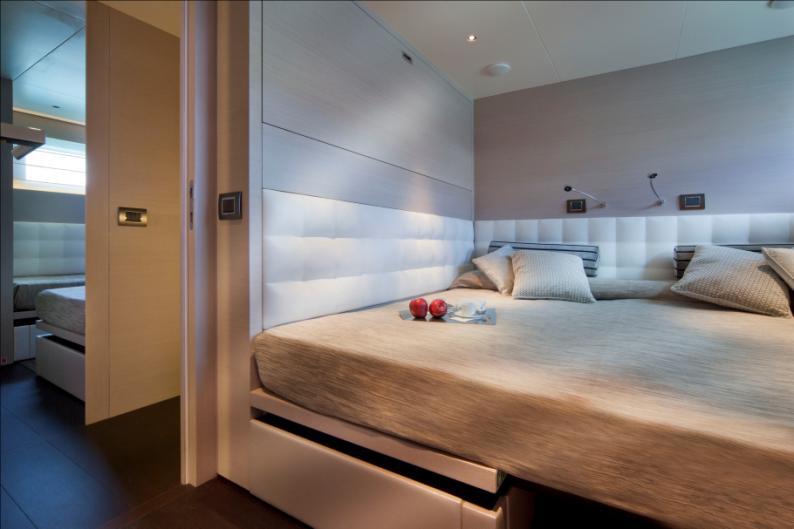 The 5 cabins on the lower deck include the full beam master suite, 2 doubles and 2 twins, which can be converted in doubles, and can be accessed through the main staircase.