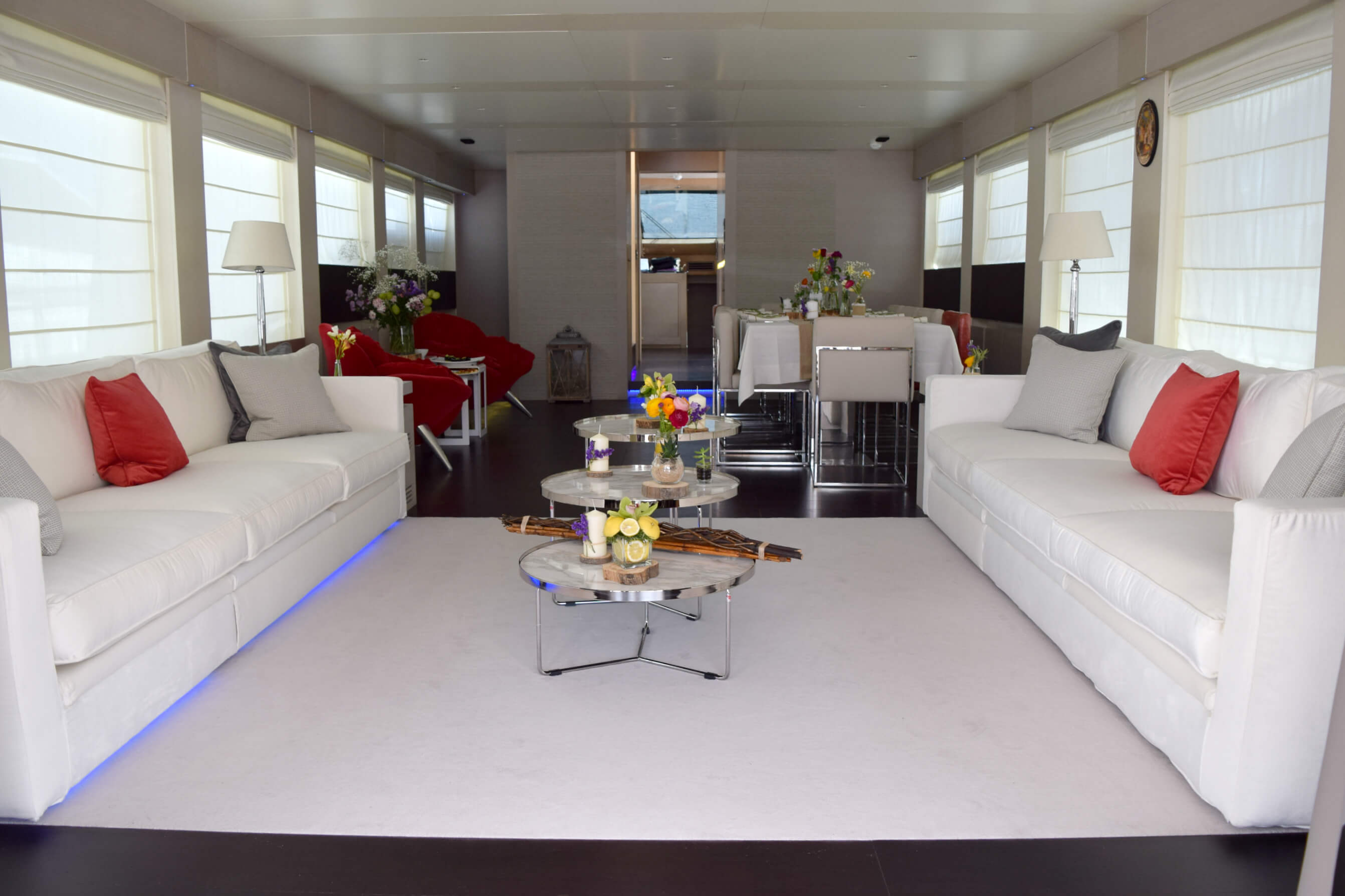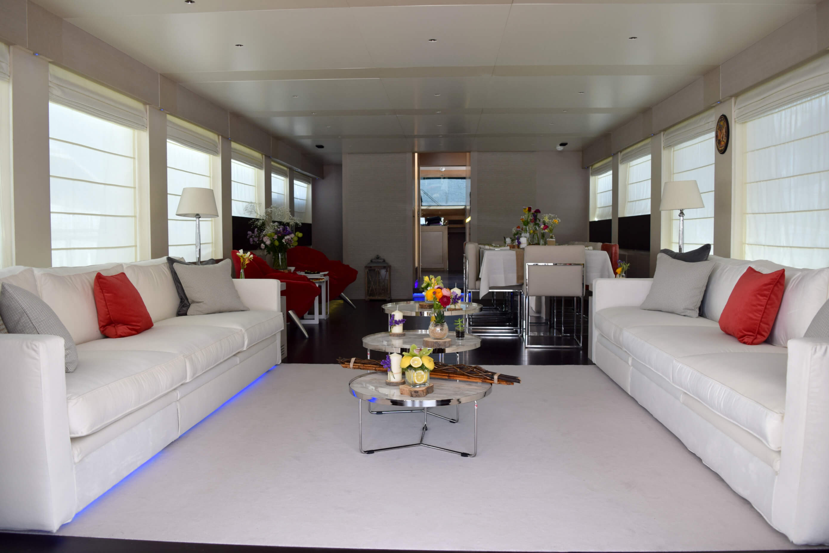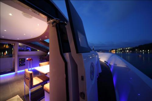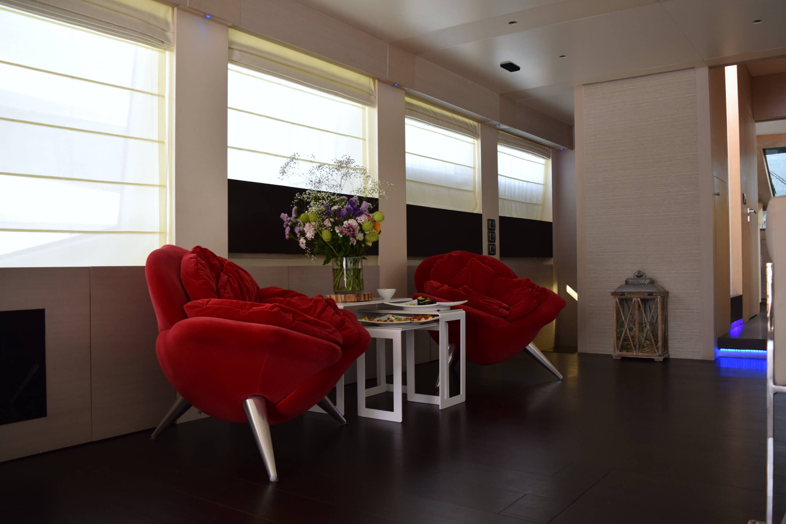 Aurora's outdoor areas are surprisingly spacious for relaxing. In the bow there is a jacuzzi surrounded by sunbathing cushions and bench. On the flybridge there is a large table for 10, which drops down to convert to a wide sunbathing area.